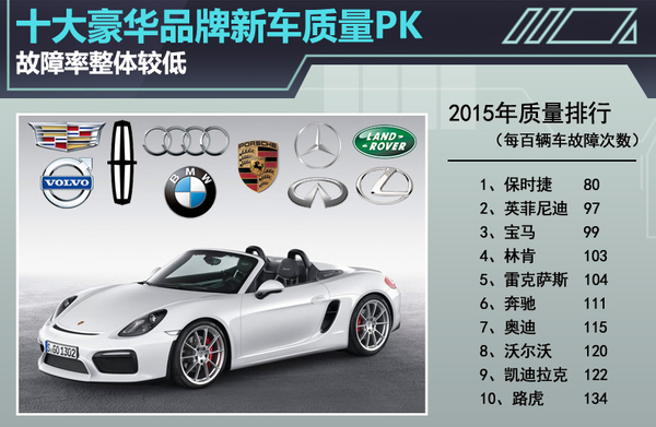 豪华品牌是否等同于高质量?近日,J.D.Power发布的2015年美国新车质量研究SM(IQS)报告给出了答案。这项报告的内容包括豪华车品牌整体排名以及豪品牌在轿车、SUV、MPV等各大小细分市场质量最靠谱的车型。网通社在对报告进行梳理后发现,质量排名前十的豪华品牌中有6个品牌每百辆新车故障率低于业内平均值,其中保时捷是十个品牌中故障次数最少的品牌。虽然另外4个品牌没有达到行业平均值,但差距也并不太明显,而且从整体故障率来看,豪华品牌整体较上一年有了小幅下降。