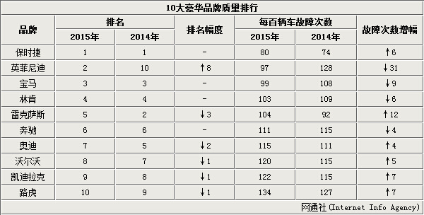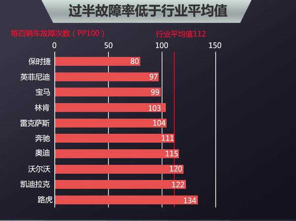 最新的排名数据中,排名前三的豪华品牌每百辆车故障次数都低于100次。保时捷仍位于排行版的冠军,前三甲中英菲尼迪是一匹黑马,直接从倒数第一上升到第二名的位置。宝马与去年持平,依旧保持在第三的位置,是德系三强中唯一进入前三甲的品牌,奔驰和奥迪分别排在第六和第七名。同为日系品牌的雷克萨斯排名下降的三名,从去年的第二名跌倒了第五名,2015年每百辆新车故障次数上升至104。在最靠后的几个品牌中,路虎排在最后一名。