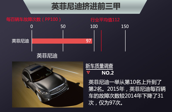 在今年的质量排行版,英菲尼迪真正实现了逆袭,从去年的第十名直接上升到第二名。而且,在质量最佳中型豪华SUV评选中,英菲尼迪QX70获得了第一名。质量最佳中型轿车的PK中,英菲尼迪Q70排在了第三名。质量排名上升的英菲尼迪今年销量也有很好的表现。2015年第一季度,英菲尼迪全球总销量突破52,000辆,同比增长12%,创下有史以来最高季度销量。在国内市场不景气的大环境下,今年1至5月,英菲尼迪在华累计销量达15,620台,同比增长36.1%。
