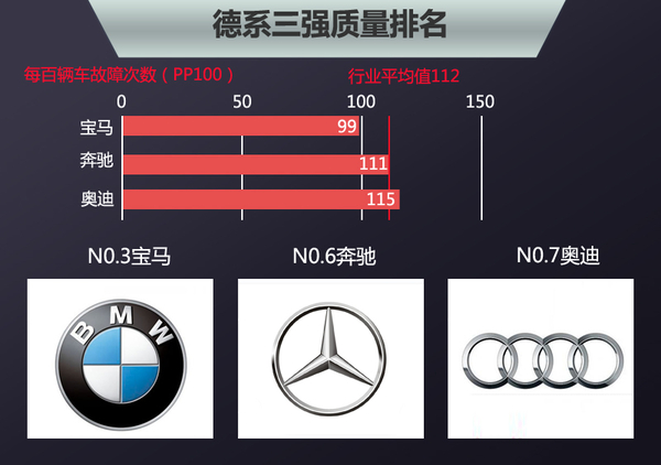 德系三强一直都是豪华车市场的巨头,在国内豪华车市场,德系三强几乎占据了豪华车市场8成以上的市场份额。但他们在美国J.D.Power质量排行上的表现却并不如销量强势。德系三强中仅宝马挤进了前三甲每百辆新车故障次数为99次;奔驰接近平均值为111次,排在第六位;而奥迪则跌到平均值以下每百辆新车故障次数为115次,较2014年上升了4次。