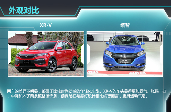 首先在外观方面,两车的差异不明显,都属于比较时尚动感的年轻化车型。XR-V的车头显得更加霸气、张扬一些,前进气格栅加入了两条镀铬装饰条,前保险杠与雾灯设计相比缤智而言,更具运动气息。