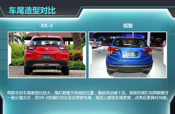 两款车的车尾差别比较大,尾灯都置于较高的位置,看起来动感十足。缤智的尾灯如两颗獠牙一般分置左右,而XR-V的尾灯由左至右贯穿车尾,视觉上感觉车尾更宽,点亮后更具时尚感。