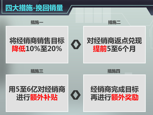 捷豹路虎将采取的四大措施是:首先将经销商的销售目标降低10%至20%,其次对经销商返点的兑现时间提前5至6个月,另外,生产厂商还将专门拿出5至6亿元资金对经销商进行额外补贴,最后,经销商完成销售目标再给予额外奖励,若目标完成超过100%,额外奖励的比例也会相应增加。