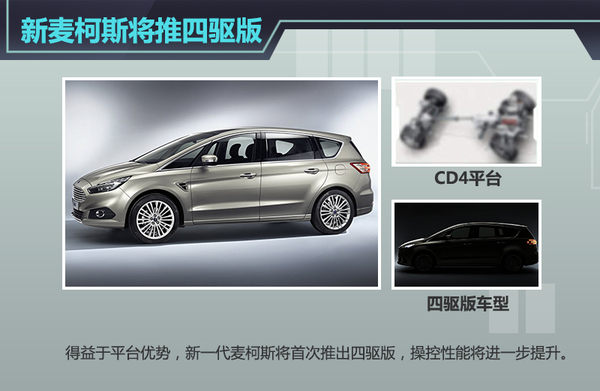 和现款车型一样,新一代麦柯斯同样诞生于福特CD4平台,该平台是一款中级车平台,能生产前驱、四驱以及搭载混合动力系统的车型,还可针对不同地域市场需求不同,对车型轴距进行调整,此前推出的蒙迪欧、新锐界等车型均出自该平台。新一代麦柯斯仍将采用三排七座设计,除推出常规前驱版本车型外,还首次推出四驱版本,操控性将得到进一步提升,这在MPV车型市场并不多见。