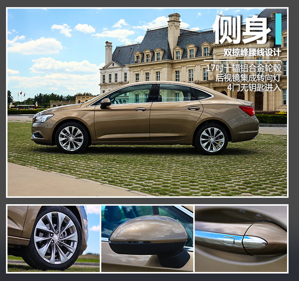 将视线转向威朗的侧身,其腰线处理采用别克经典的sweep spear弧光曲棱线条式设计,与别克最新推出的旗舰轿车Avenir概念车相仿,以0.618的自然界黄金比例营造出良好的视觉效果。此外,车门把手及车窗边缘均采用镀铬饰条装饰,符合中国消费者的审美品位,而四个车门把手均具备无钥匙进入功能更是体现了设计的人性化。
