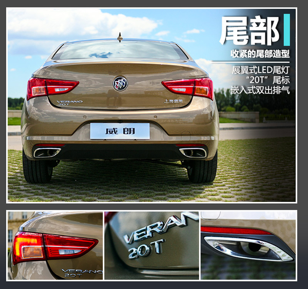 来到新车的尾部,一体式扰流尾翼直接由后备箱上端勾勒出来,有助于理顺整车尾部气流,但在笔者看来主要还是用于在视觉上增添运动气息。该车尾部最让笔者感到眼前一亮的莫过于排气的样式,排气尾喉采用多用于豪华车的一体化嵌入式设计,并以高亮镀铬饰圈进行装点,提升档次感。有了这样的双边共两出排气,别克威朗的“逼格”一下就变得不一样了。
