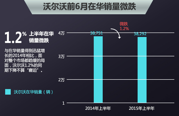 2015年1-6月沃尔沃品牌在中国的零售销量为38,292辆,2014年同期为38,751辆,同比下跌1.2%。与在华销量得到迅猛增长的2014年相比,今年上半年的表现平平。