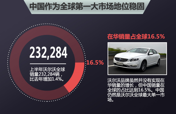 2014年可以说是沃尔沃品牌在中国市场非常辉煌的一年,不仅创造了在华销量的历史新高,更是以17.43%的占比超过美国成为全球第一大市场。在刚刚过去的2015年上半年,沃尔沃品牌虽然并没有实现在华销量的增长,但中国销量在全球的占比依然不低,达到了16.5%。另外,中国市场作为全球最大单一市场的地位仍然十分稳固。