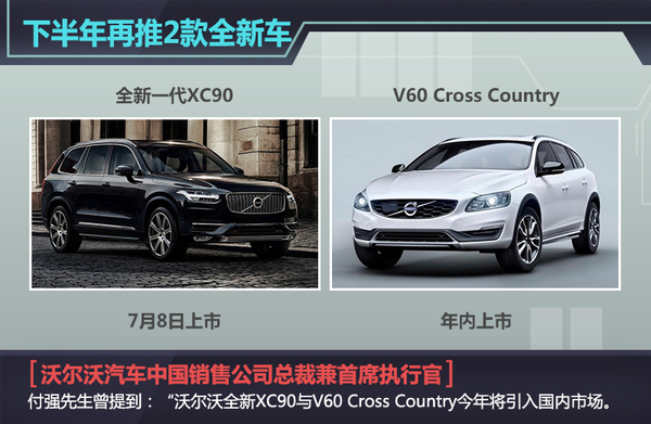 对于沃尔沃品牌2015年的新车计划,沃尔沃汽车中国销售公司总裁兼首席执行官付强曾提到:“沃尔沃全新XC90与V60 Cross Country今年将引入国内市场。”作为沃尔沃旗下的全新旗舰SUV,全新一代XC90除了外观内饰的常规改动外,还首次推出如“四缸Drive-E动力系统”、“路面偏离保护系统”等9项重大改动,这也成为全新XC90这款对沃尔沃有着划时代意义新车型的最大亮点所在。据悉,该车将于7月8日正式在中国地区上市销售。除全新XC90之外,跨界风格浓郁的V60 Cross Country将是今年年内沃尔沃品牌向中国市场引入的另一款全新车型。