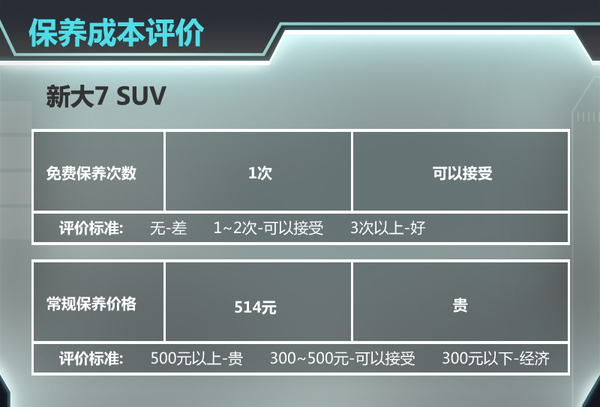 总结:因各地以及经销商之间存在工时费的价格差异,所以上述内容并不包含“工时”价格,具体价格还应该以当地经销商为准。而且从纳智捷生活馆维修间可以看到,纳智捷品牌更注重维修间的环境,维修保养透明提供更好的用户体验。总体来说,新大7 SUV保养价格在自主品牌中优势并不大,这主要是由于机油价格品质较好,导致价格攀升较为明显。虽然10000公里或6个月的保养周期与其他自主车型拉开一定差距,但最终价格并没有过于惊喜。