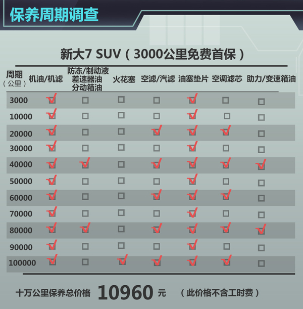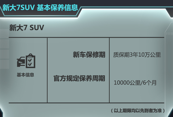 新大7 SUV的首次保养期限为车辆行驶到3000公里或者3个月(时间和里程以先到为准),此后按照每10000公里或6个月(时间和里程以先到为准)为一次保养周期。新大7 SUV的保养周期里程在自主品牌中属于较好水平,其中车辆首保更换的配件包括机油、机滤以及一些常规的检查项目,此后的每次保养在此基础上,按照保养手册增加的不同项目以及选择性项目进行保养。