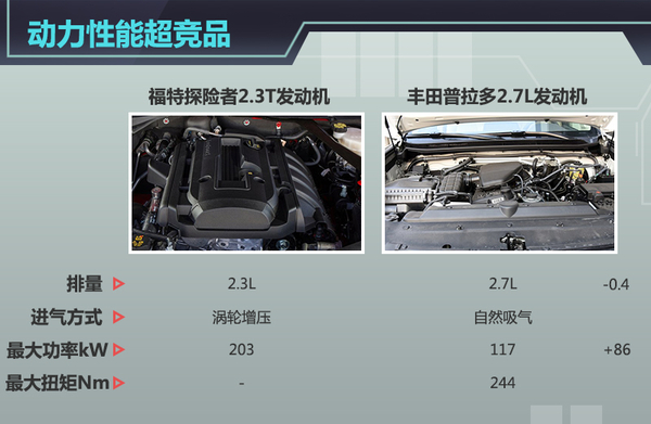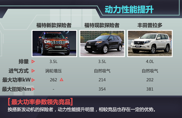 福特新款探险者将搭载的2.3L EcoBoost涡轮增压发动机,应用燃油缸内直喷、涡轮增压和双独立可变气门正时系统等关键技术,此前已搭载在福特新Mustang、福克斯RS上,探险者此次搭载的2.3T发动机在参数调校方面与后两者有所区别,最大功率达到203kW,匹配自动变速箱后,新车综合工况下百公里油耗为9.6L,相比现款车型油耗(10.2L)下降了0.6L。与丰田普拉多搭载的2.7L发动机相比,动力性能占据一定优势。