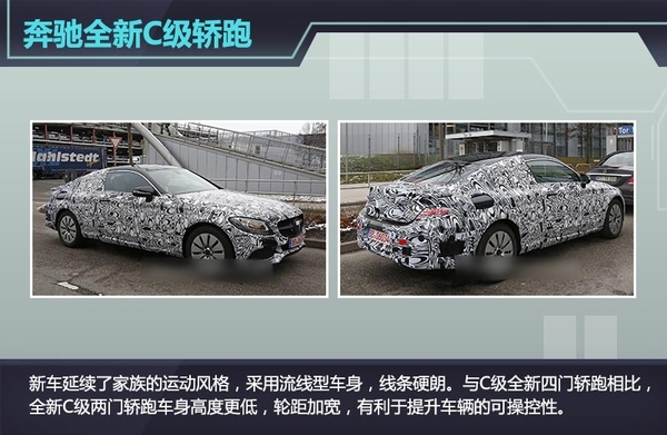 外观上,新车延续了家族的运动风格,采用流线型车身,线条硬朗。前脸处采用传统晶钻单幅隔栅,头灯细长犀利有神。与C级全新四门轿跑相比,全新C级两门轿跑车身高度更低,轮距加宽,有利于提升车辆的可操控性。