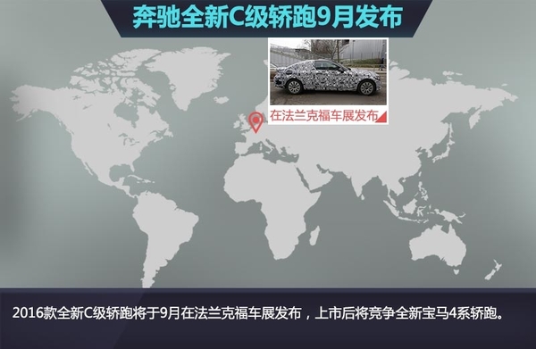 全新C级车型包括轿车版、estate版、轿跑版和Cabrio版,各车型均采用相同技术和安全措施。动力方面,轿跑版与轿车版和estate版的发动机配置相同,搭载2.0T四缸引擎和3.0T双涡轮V6引擎,而高端版AMG和AMG S将搭载4.0T双涡轮V8引擎,各车型的最大功率输出将保持一致。2016款全新C级轿跑将于9月在法兰克福车展发布,上市后将竞争全新宝马4系轿跑。