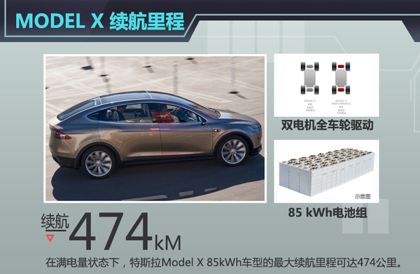 据悉,量产的MODEL X将配备85kW/h的电池组,最大输出功率达到515kW,零到96公里加速时间为3.2s,满电的情况下续航里程达到474公里。新车采用双电机全轮驱动技术,可独立数字控制前轴和后轴,使得整车的牵引力、稳定性、操控性能都相应提高。