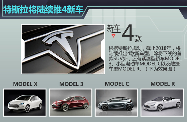 随着纯电动汽车市场的升温,特斯拉已计划进军更多的细分市场。根据特斯拉的新车计划,2018年前,将陆续推出4款全新车型。除近期将在华上市的首款SUV车型—MODEL X外,特斯拉之后还将推出小型电动车MODEL C、紧凑型轿车MODEL 3以及一款敞篷车型MODEL R。