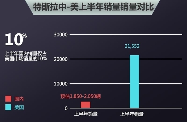 数据显示,特斯拉今年一季度在美国市场销量达10,045辆,第二季度达11,507辆,环比增长了15%,同比增长52%。如能保持如此快速的销量增长速度,特斯拉实现其年销量目标55,000指日可待,上半年总销量21,552辆,第三季度将冲刺13,500辆,第四季度销量有望突破15,000辆。不过,特斯拉在中国的销量状况则极其惨淡,前5个月销量仅有1729辆,鉴于6月份国内销量依然不振,上半年销量估计在1,850-2,050辆之间。