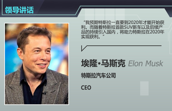 中国是特斯拉最为重视的市场之一,其新车型推出后均将同步入华。不久前特斯拉CEO马斯克坦言:“我预期特斯拉一直要到2020年才能开始获利。而随着特斯拉首款SUV新车以及后续产品的持续引入中国国内,将助力特斯拉在2020年实现获利。”