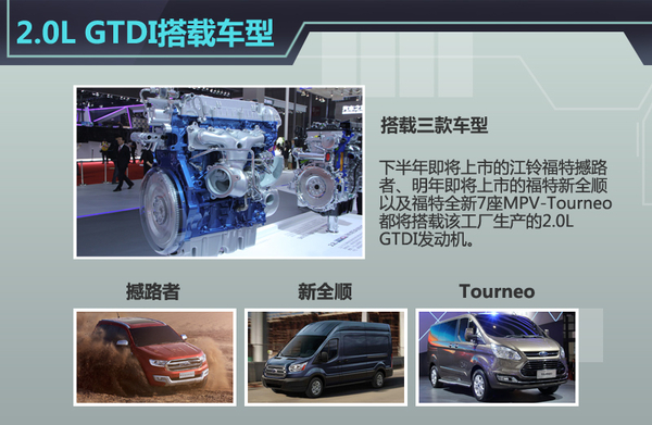 2014年,福特品牌在中国累积销售新车114.66万辆,同比增长19%,中国市场的重要性已经毋庸置疑。而2015年作为福特“1515”战略的收官之年,其今年所取得的成绩能够对未来福特在中国的战略有所影响,为把握住这个关键时间节点,厂家也在做着相应的规划。日前,网通社从福特官方获悉:福特2.0L GTDI发动机已正式在小蓝汽油机工厂正式投产,这标志着福特在华实现了新的突破。该款发动机未来将搭载于江铃福特撼路者、福特新全顺、Tourneo三款车型上。