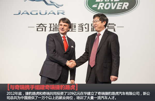 2012年底,捷豹路虎和奇瑞共同投资了109亿元在华建立了奇瑞捷豹路虎汽车有限公司,新公司总共为中国提供了一万个以上的就业岗位,培训了大量一流汽车人才,新公司快速的发展也为中英双方带来了双赢的好局。