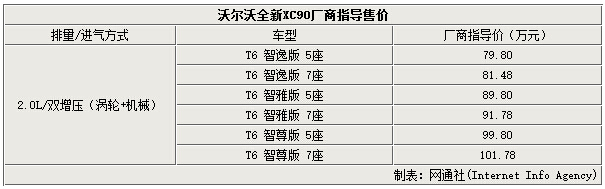 全新XC90作为基于沃尔沃斥资110亿美元打造的SPA平台的首款量产车型,它的推出对沃尔沃有着极其重要的意义。今日,沃尔沃全新一代XC90在上海正式上市,网通社从沃尔沃中国官方获悉:沃尔沃全新XC90共推出6款车型,分为5座和7座版本,新车厂商指导价区间为79.8-101.78万元。