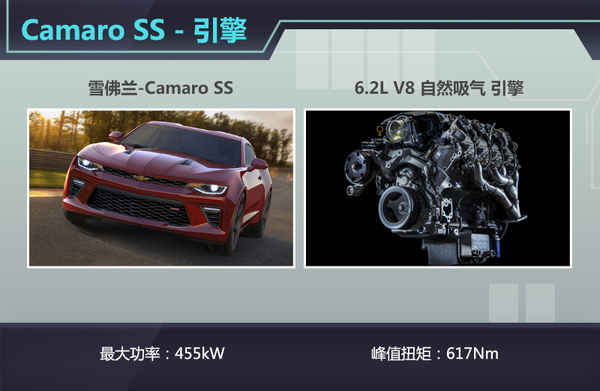 由于雪佛兰全新Camaro SS定位于高性能版跑车,因此搭载一套动力更为强劲的动力总成是必不可少的。新车在引擎舱内被植入了一台6.2L V8自然吸气引擎,得益于工程师们的精心调教,这台全新引擎能够产生455kW的最大功率和617Nm的峰值扭矩,而主动式悬挂也能以每秒1000次的速率对路况进行侦测,从而与强劲的动力总成相匹配。