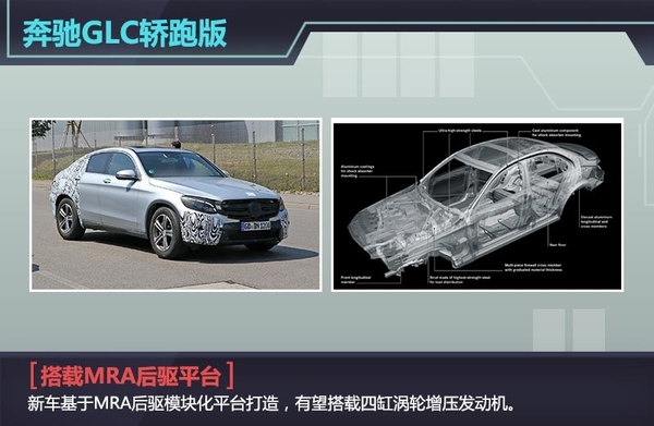 新车与C级轿跑的平台相同,均基于MRA后驱模块化平台打造,有望搭载四缸涡轮增压发动机,匹配9速自动变速箱,输出功率至少为130kW,GLC400轿跑最大输出功率可达245kW,GLC450 AMG轿跑的最大输出功率将达到270kW。