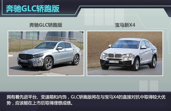 虽然今年的车市普遍惨淡,但奔驰却逆势保持了高速增长,并陆续被曝光了多款新车计划。拥有着先进平台、变速箱和内饰,GLC轿跑版将在与宝马X4的直接对抗中取得较大优势,应该能在上市后取得理想成绩。