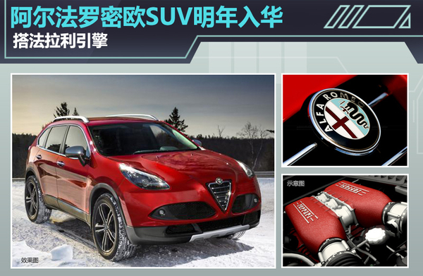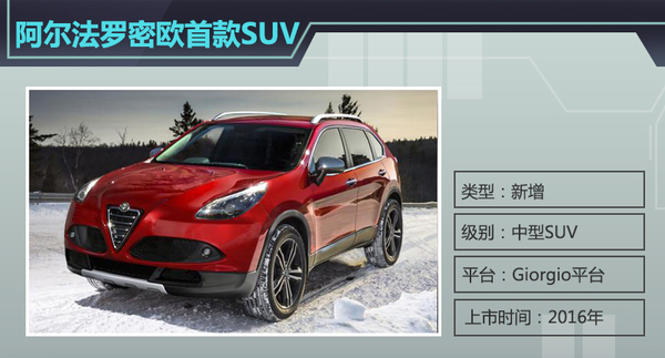 阿尔法罗密欧首款SUV车型并将会基于其全新Giorgio平台打造,此平台适用于后轮驱动和全轮驱动系统的平台,新车在尺寸有望与宝马X3相仿。此款SUV结合阿尔法罗密欧独特的家族化前脸与溜背式造型设计,运动感十分强烈。新车将于2016年推出。