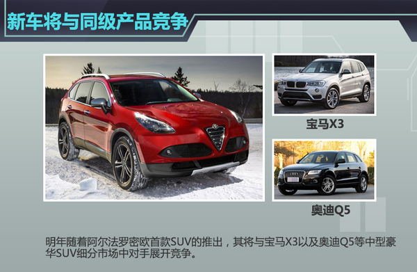 随着中型豪华SUV市场的持续火热,宝马、奥迪等众多豪华车企均已推出了相应车型。作为豪华品牌的阿尔法罗密欧,始终没有推出一款SUV领域的车型。而明年随着阿尔法罗密欧首款SUV的推出,将与宝马X3以及奥迪Q5等该细分市场中对手展开竞争。但在销量方面,其中宝马X3作为进口车型,其在2014年的上牌量达到3.16万辆;拥有国产优势的奥迪Q5在2014年销量则达到10.7万辆,市场表现在同级车型中处于领先位置,阿尔法罗密欧SUV引入国内后,是否能对上述豪华中型SUV构成威胁,还有待经过市场检验。