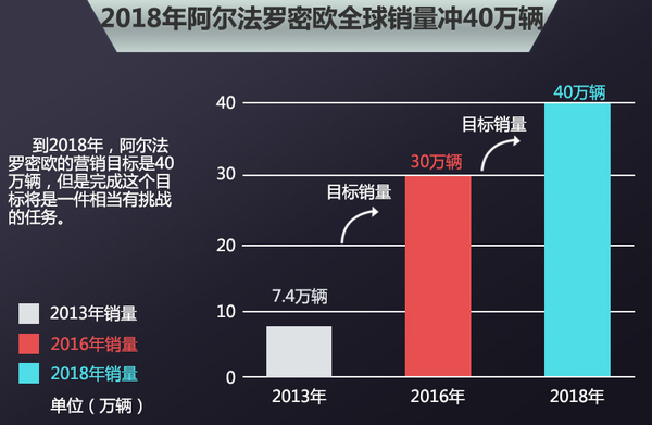 到2018年,阿尔法罗密欧的营销目标是40万辆,但是完成这个目标将是一件相当有挑战的任务。近十年来,阿尔法罗密欧都没有盈利,2013年阿尔法罗密欧的全球交付下降56%,至7.4万辆,创下自60年代末以来的最差水平。而该品牌凭借纳入菲亚特克莱斯勒集团后进行重新改组的契机,获得投资并实现集团间的技术共享,凭借全新SUV以及其他系列车型的推出,将有望实现销量和效益的快速增长。