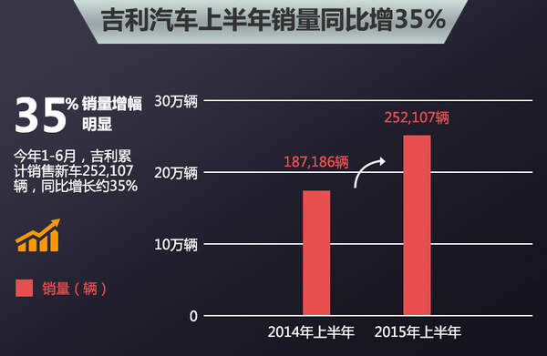 吉利汽车自经过战略转型后,旗下产品脉络比之前清晰很多,市场表现也有了较为明显的提升。日前,网通社从吉利汽车官方获悉:今年1-6月,吉利累计销售新车252,107辆,同比增长约35%,达到2015年全年销量目标45万辆的56%。与此同时,吉利还在制定未来新一轮的产品投放计划,到年底前还会推出2款新车。
