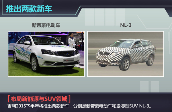 按照规划,吉利汽车在未来几个月中将重点针对新能源汽车和SUV两个细分市场进行部署。吉利汽车行政总裁桂生悦此前在接受媒体采访时表示:吉利争取在今年八月推出帝豪电动车,另计划于今年第四季度推出代号为NL-3的全新紧凑SUV。