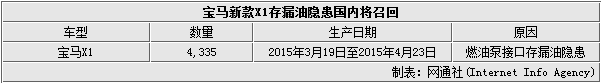 根据国家质检总局公布的消息,本次召回车型为部分华晨宝马X1 sDrive18i, X1 xDrive20i及X1 xDrive28i汽车,生产日期为2015年3月19日至2015年4月23日,共涉及4,335辆。