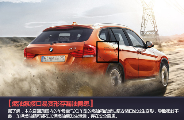 据了解,本次召回范围内的华晨宝马X1车型的燃油箱的燃油泵安装口处发生变形,导致密封不良,车辆燃油箱可能在加满燃油后发生泄漏,存在安全隐患。