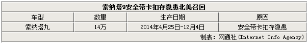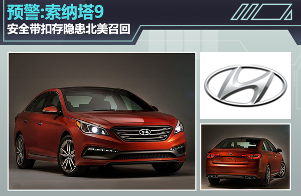 第九代索纳塔于今年年初正式国内上市,在升级车辆科技配置以及动力以外,在安全配置方面值得关注,近日中国汽车技术研究中心发布了2015年第二批车型C-NCAP评价结果显示,第九代索纳塔以60.7分的成绩创造最高分,并获得唯一的超五星评价。日前,网通社从美国高速公路安全管理局(NHTSA)了解到,由于车辆安全带扣存在堵塞和不固定隐患,韩国现代公司将在北美地区召回部分2015款第九代索纳塔,将涉及14万辆左右。