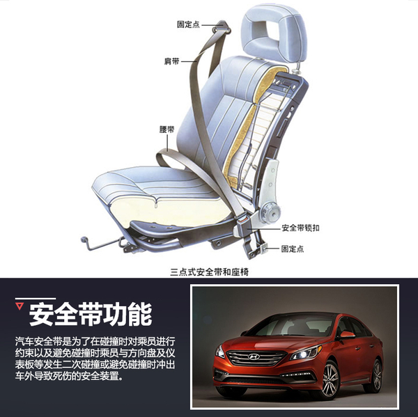 汽车安全带是为了在碰撞时对乘员进行约束以及避免碰撞时乘员与方向盘及仪表板等发生二次碰撞或避免碰撞时冲出车外导致死伤的安全装置。汽车安全带又可以称之为座椅安全带,是乘员约束装置的一种。汽车安全带是公认的最廉价也是最有效的安全装置,在车辆的装备中很多国家是强制装备安全带的。(网通社2015年7月10日北京报道)