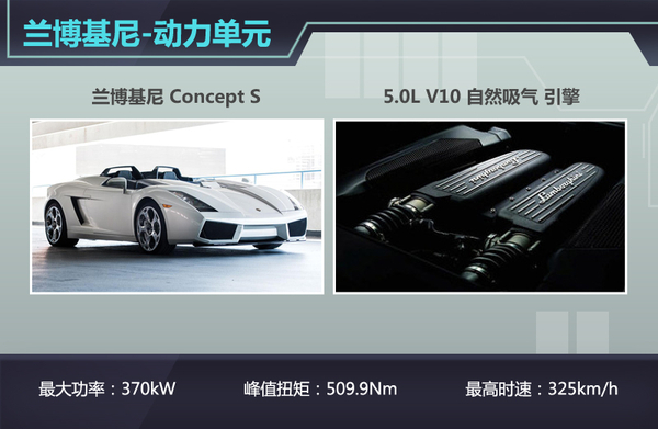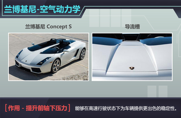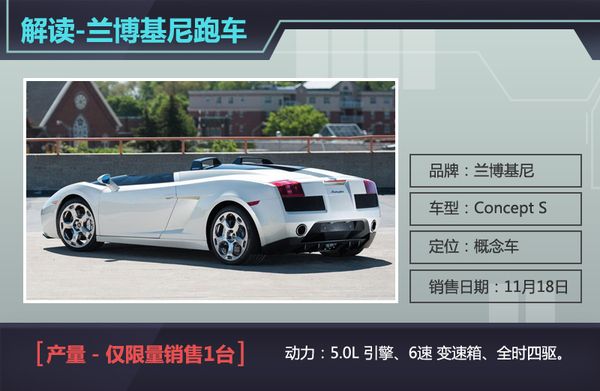 兰博基尼Concept S作为一款概念车,是以兰博基尼Gallardo为基础设计,已于2005年在日内瓦车展上首度亮相。Concept S将座舱划分为左右两单座区域,座位后方也分别设有导流口,导引气流通过功率强大的中置引擎提高散热效率,这种设计使其外观上更具霸气和未来感。