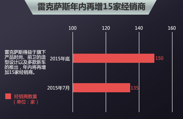 雷克萨斯NX于去年11月正式上市,该车近几个月以来单月销量都保持在3000台左右,是雷克萨斯绝对的主力车型,为了进一步提升产品竞争力,雷克萨斯继今年上半年推出三款限量版车型之后,下半年将会再推出全新RX等五款新车。与此同时,雷克萨斯还将发力经销商渠道建设,日前,雷克萨斯中国执行副总经理江积哲也在与网通社编辑沟通时表示:“目前我们(雷克萨斯)有135家经销商,年底将增加至150家左右。”