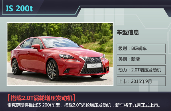 B级轿车IS是雷克萨斯旗下继中型SUV NX之后第二款搭载2.0T涡轮增压发动机的车型,这款增压发动机动力输出强劲,最大功率180kW,最大扭矩则达到了350Nm,与现款IS搭载的2.5L自然吸气发动机相比动力输出更有优势,IS 200t发动机排量得到降低并且动力更强,该车在同级别车型中的竞争力将得到大幅提升。