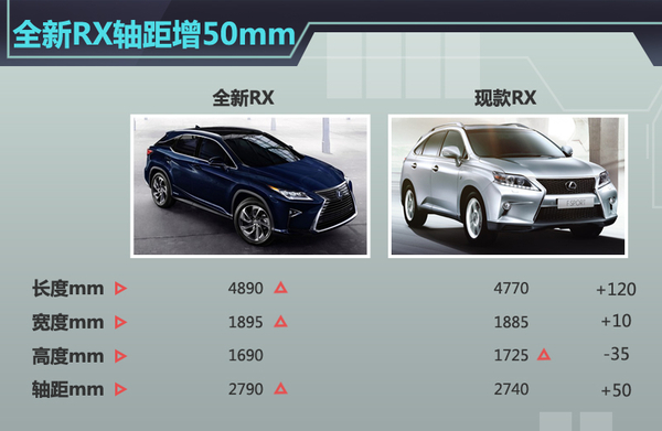 雷克萨斯全新一代中大型SUV RX于今年四月举办的上海车展上国内首发亮相,新车分为RX450h和RX350 F SPORT两种版本,其中RX350 F SPORT将搭载3.5L V6自然吸气发动机,最大功率224kW,RX450h搭载由3.5L V6阿特金森发动机与电动机组合而成的混合动力系统,综合功率同样为224kW。此外,全新RX车身尺寸得到升级,轴距增加50mm,车身长度更是增加了120mm,但是新车高度有所降低,给人的感觉将更加趋于扁平。