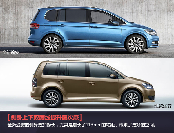通过全方位的对比,全新一代途安最大的亮点就在于车身长度以及轴距的增加。得益于MQB模块化平台的灵活性,新车的车长和轴距与现款车型相比分别增加了130和113mm。尤其是达到2,791mm的轴距,甚至超过了刚刚在华上市不久的宝马2系多功能旅行车。