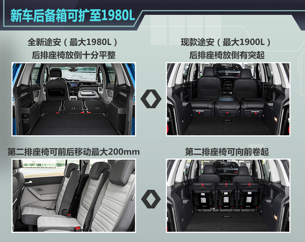 1、全新途安轴距加长113mm后备厢最大可扩展到1980L