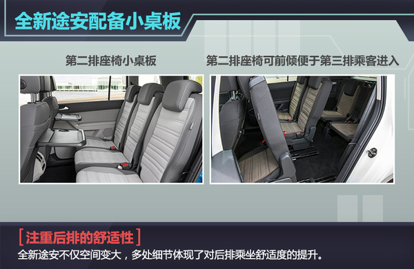 另外,在新一代车型上,大众途安在第一排座椅靠背的背面设计了小桌板供乘坐在第二排的乘客进行使用,体现了途安作为一款MPV车型的多功能性。而对于采用“2+3+2”7座布局的全新途安来说,第二排座椅不仅可以向前移动,还可进行前倾,为乘客进入第三排提供了更大的便利,比现款7座车型更加便捷。