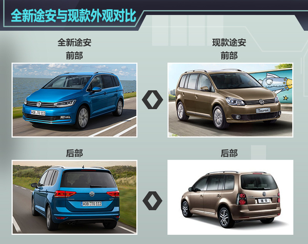 迄今为止,大众途安这款注重多功能性的紧凑级MPV车型在全球范围内的销量已突破了130万辆。该车自2003年以国产的方式进入中国以来,仅在2011年进行了一次换代。随着车型更新周期越来越短,第二代途安上市不到5年的时间就进行了换代。在今年3月份的日内瓦车展上大众正式发布了全新一代途安,新车基于MQB平台打造,将有望在明年一季度实现国产。日前,网通社对全新一代途安和国内在售的现款车型进行对比后发现,新平台的应用使全新途安的轴距大幅加长,从而在空间方面有着显著的提升。此外,外观、配置和动力系统均有不小的变化。