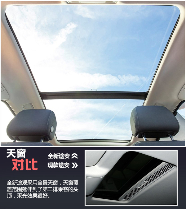 在配置方面,可以明显看到新一代车型的中控彩色显示屏尺寸有所增大,其多媒体系统也比现款车型进行了版本的升级。同时,在原有的双温区自动空调、泊车辅助、自动泊车等功能配置的基础上,新车还增加了一键启动、电子驻车系统、发动机智能启停系统等。此外,非常值得一提的是全新途安采用了全景天窗,目测其尺寸近乎于现款车型的3倍,带来了良好的采光效果。
