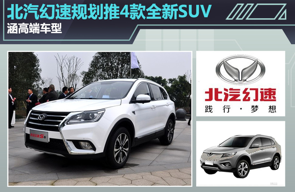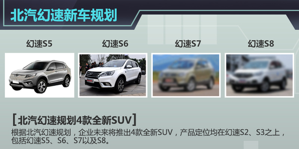 根据北汽幻速规划,企业未来将推出4款全新SUV,产品定位均在幻速S2、S3之上,包括幻速S5、S6、S7以及S8。幻速S5定位为小型SUV,未来目标会锁定哈弗H2这类车型。幻速S6定位为紧凑型SUV,未来竞争对手将会是哈弗H6这类车型,新车预计9月正式上市。幻速S7、S8属于北汽幻速未来的高端SUV车型,投放市场后直接对标哈弗H8。值得一提的是,上述4款SUV车型未来还将推出混动版和插电式混动版,预计2017年发布。