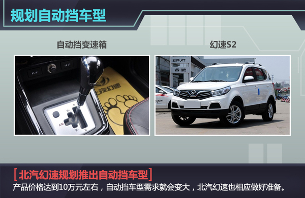 目前,越来越多的车型匹配自动变速箱,以达到产品配置全面同时满足这方面需求的消费者。对于自动变速箱的普及,北汽银翔汽车有限公司董事兼总经理白天明表示,6万元左右的车型由于市场需求有限,同时一些四五线城市的消费者认为自动挡车型油耗高、维修成本贵、开起来‘没劲’,北汽幻速并没有在此区间产品布局更多动力类型。然而,价格达到10万元左右,自动挡车型需求就会变大,北汽幻速也相应做好准备。今年7月幻速S2将会匹配4AT变速箱,S3将在9月匹配5AT变速箱,预计9月上市的幻速S6将匹配来自邦奇的CVT变速箱。到2016年,北汽幻速将推出幻速S6 2.0T+6AT的动力组合。此外,北汽幻速目前还在研发7速双离合变速箱,预计2017年正式匹配相关车型。