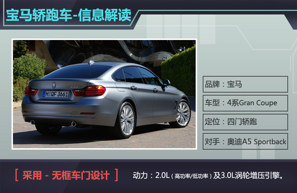 宝马作为来自于德国的豪华汽车制造商,对于运动型车款的研发具有较为丰富的经验,而宝马在推出4系轿跑车之后并不甘于现状,进而推出了其衍生版车型。近日网通社从车迷世界Worldcarfans获悉:宝马将推出全新运动型轿跑车4系Gran Coupe,新车在动力总成中搭载了与双门轿跑版4系相同的动力总成,但全新四门的车身结构使其在运动之余更具优雅气质。