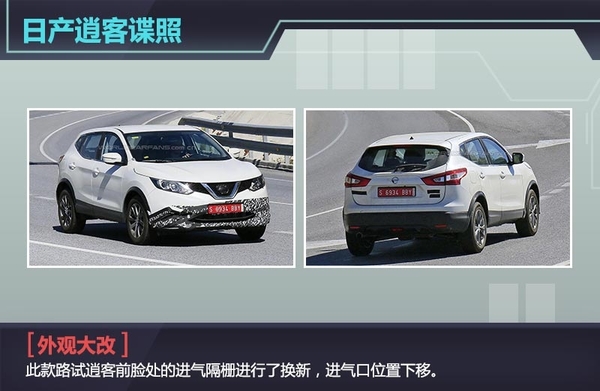 从谍照来看,此款路试逍客基本上沿袭了现款逍客的整体设计风格,融合了轿车的精致和SUV的大气。外观上,路试车辆进行了较大改动,前脸处的进气隔栅进行了换新,进气口位置下移。由于日产官方未公布任何信息,因此暂不得知此款路试车辆是否为逍客的全新衍生车型或特别版车型,或是否在测试日产的全新引擎。